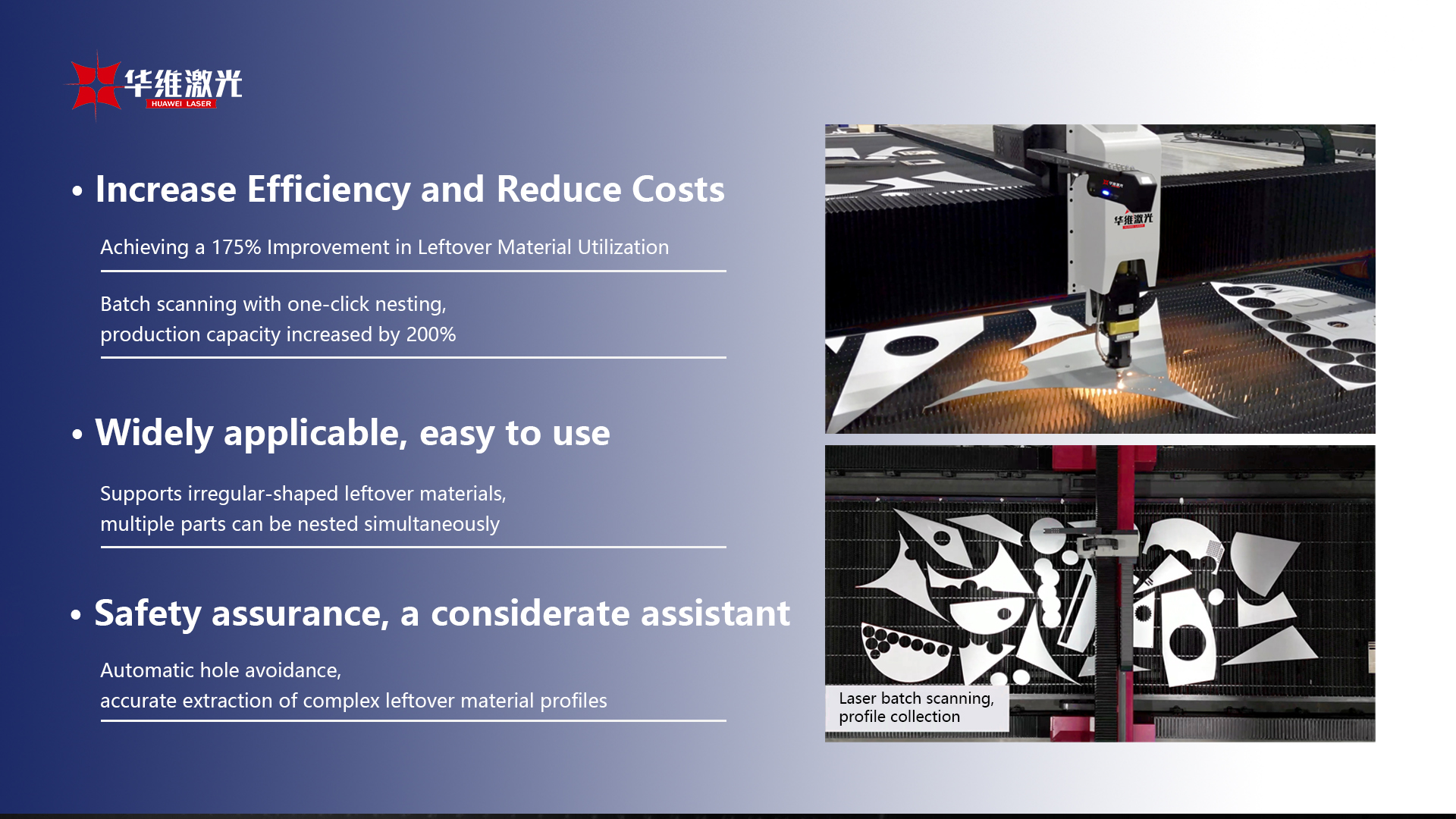 Μία από τις βασικές τεχνολογίες του συστήματος είναι η σάρωση παρτίδας λέιζερ και η αυτόματη σφαίρα. Χρησιμοποιώντας σάρωση με λέιζερ υψηλής ακρίβειας, το σύστημα μπορεί γρήγορα να σαρώσει υλικά θραύσης, να ψηφιοποιήσει τα δεδομένα και να εντοπίσει αυτόματα το σχήμα και τη θέση των θραυσμάτων, παρέχοντας ακριβείς πληροφορίες για την επακόλουθη φωλιά. Το σύστημα υποστηρίζει ένα κλικ αυτόματο-nesting, αυτόματα δημιουργώντας σχέδια φωλιάσματος. Αυτό όχι μόνο μειώνει τη χειροκίνητη παρέμβαση και βελτιώνει την ακρίβεια της φωλεοποίησης αλλά και ενισχύει τη χωρητικότητα της γραμμής παραγωγής κατά 200%. Αυτό το χαρακτηριστικό ενισχύει την αποτελεσματικότητα της παραγωγής και μειώνει σημαντικά τους κύκλους παραγωγής.